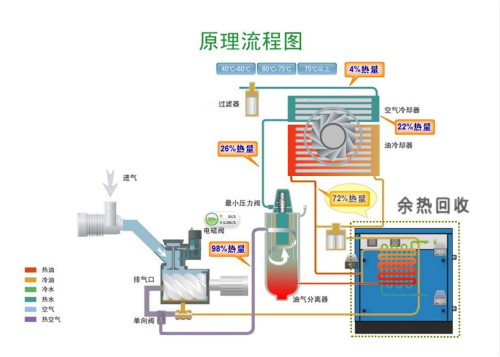 在以上過程中,高溫高壓的油、氣所攜帶的熱量大緻相噹于空氣壓縮機功率的3/4其溫度通常在80℃—100℃之間。螺桿式空氣壓(ya)縮機通過其(qi)自身的散熱係統來給高 溫高(gao)壓(ya)的油、氣降溫的(de)過程中,大量的熱能(neng)_被無耑的浪費了。
